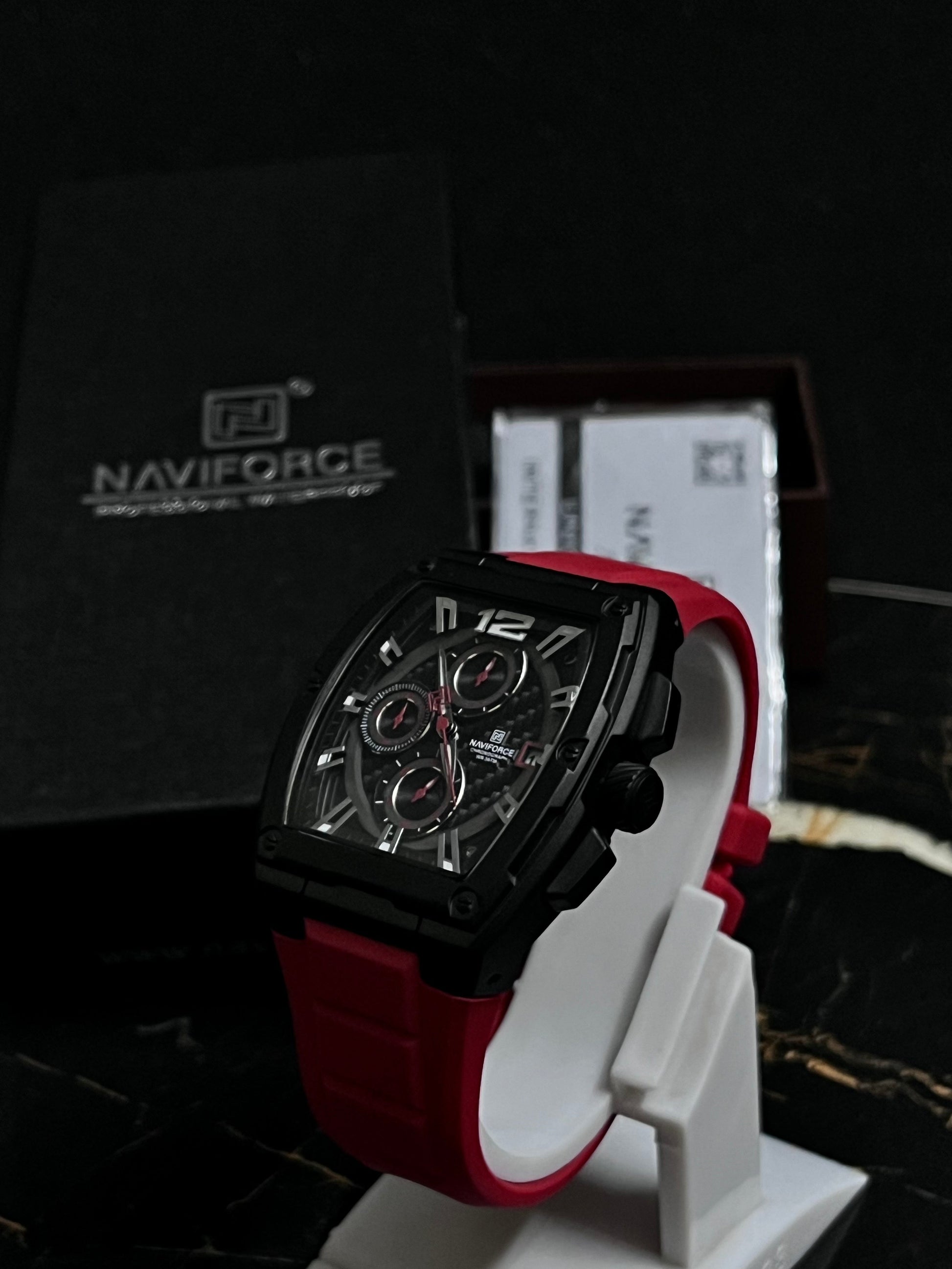 Dominate the tracks and the streets with a timepiece engineered for those who live life in the fast lane. This Naviforce Chronograph draws inspiration from high-performance racing machinery, featuring a striking tonneau-shaped case that commands attention. The intricate carbon-fiber textured dial is accented by vibrant red details, creating a perfect synergy of industrial grit and contemporary luxury.