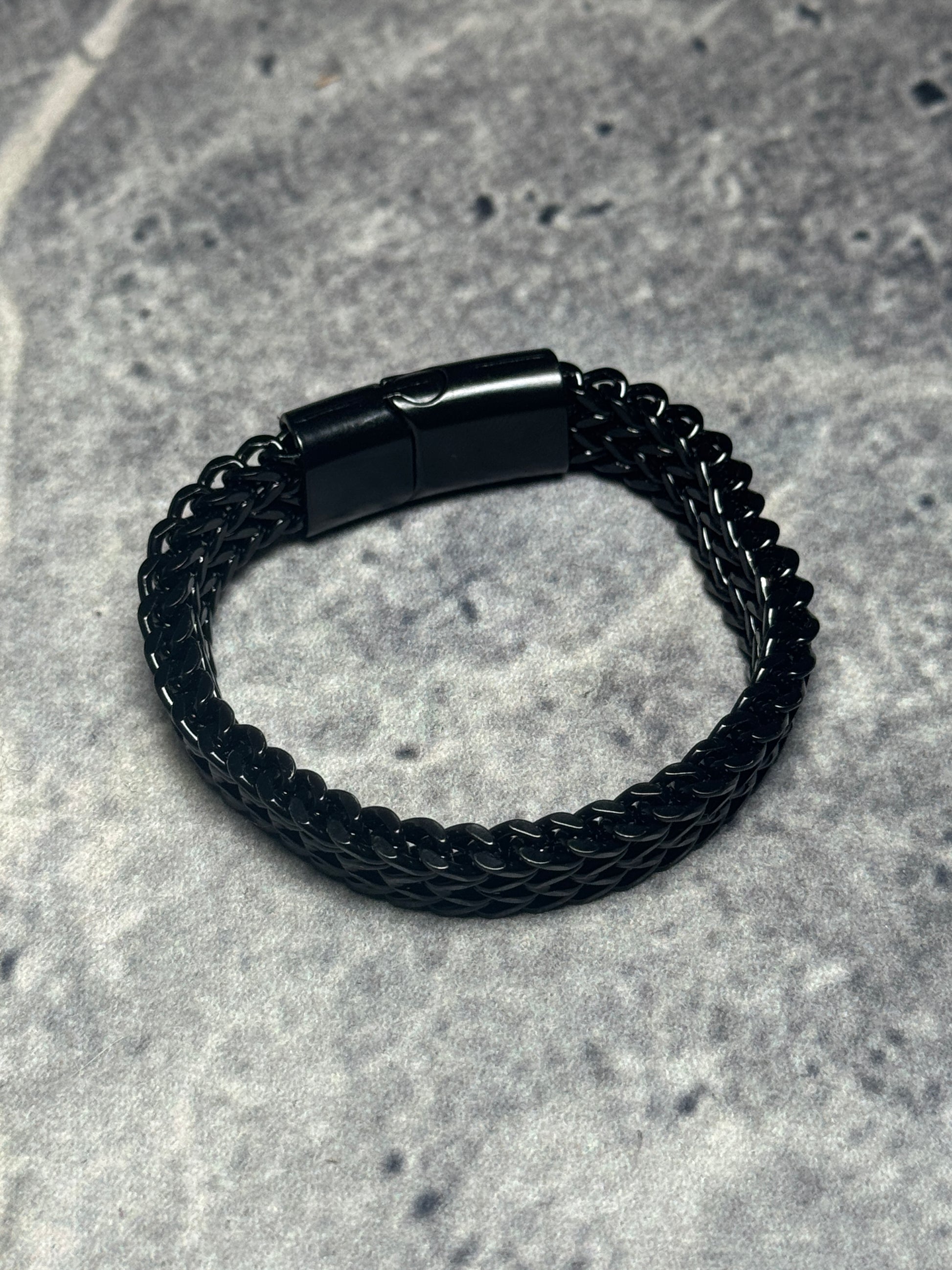 Built for the modern man who values strength and style. This heavy-duty bracelet features two rows of interconnected wheat links finished in a deep, matte black. Its substantial weight and tactical aesthetic make it the ultimate anchor for your wrist game.