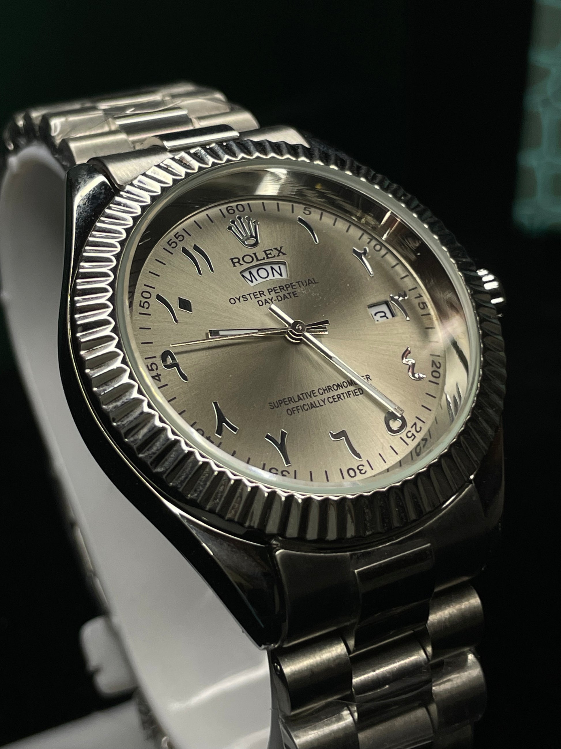 Make a powerful statement with the Rolex Day-Date, featuring the rare and refined Cold Sand dial, complemented by a classic fluted bezel and Arabic numeral hour markers. This distinctive configuration blends Rolex’s timeless elegance with a touch of cultural identity and modern sophistication.