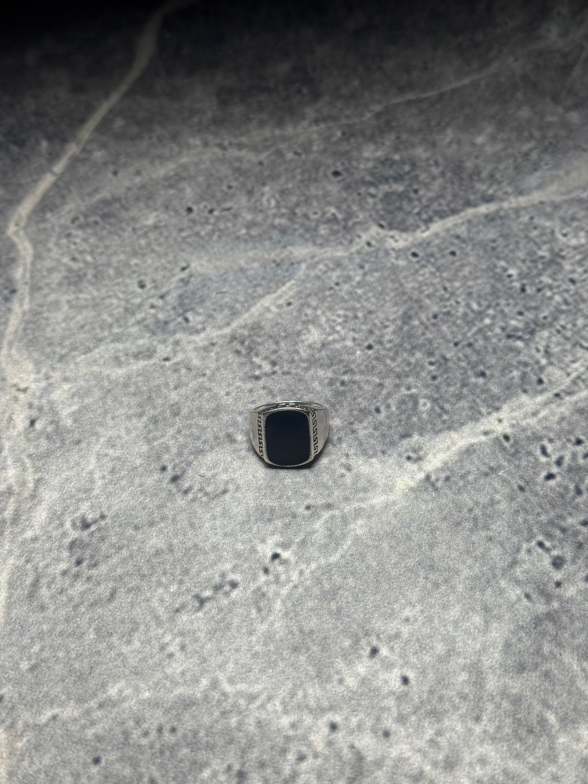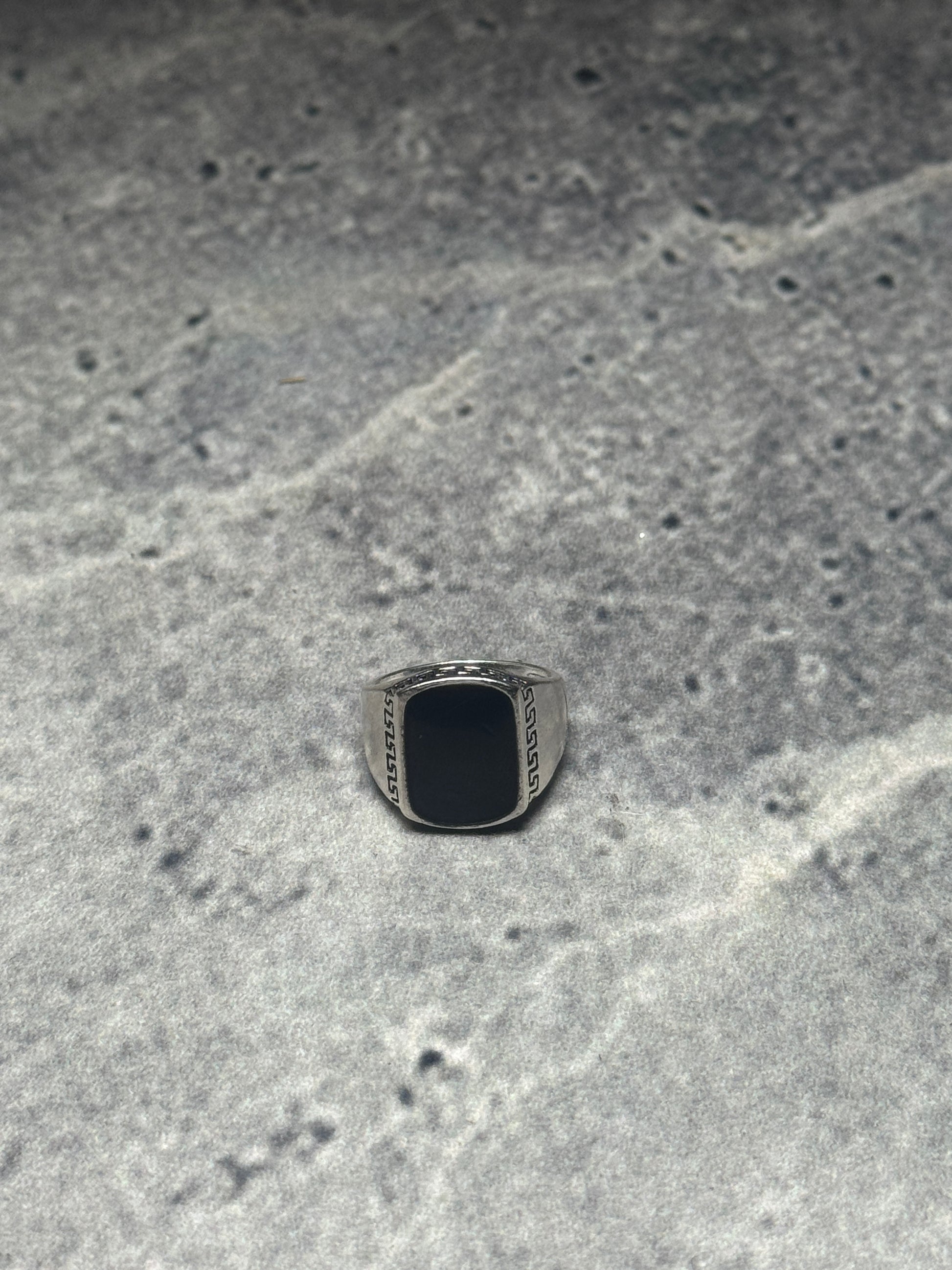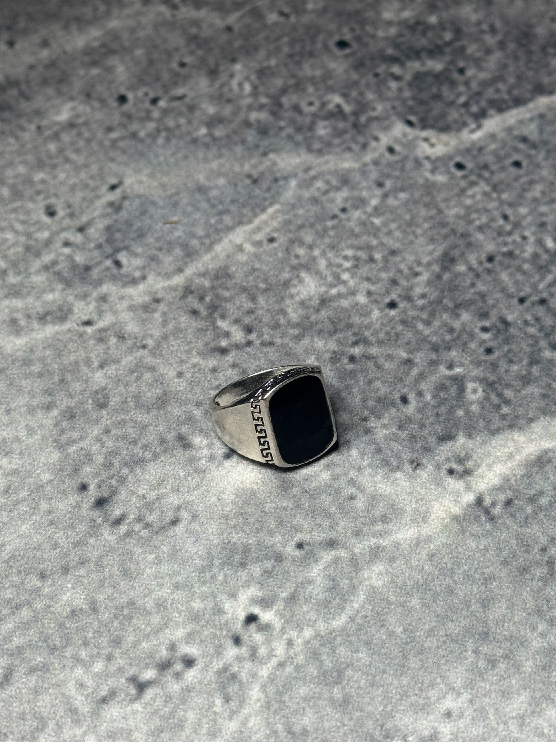 Elevate your hand game with a piece that blends classical history and modern edge. This silver-tone signet ring features a bold, rectangular midnight black inlay. The shoulders of the ring are intricately engraved with a traditional Greek Meander (Key) pattern, symbolizing eternity and unity. Its substantial profile makes it a perfect anchor for any ring stack or a powerful standalone statement.
