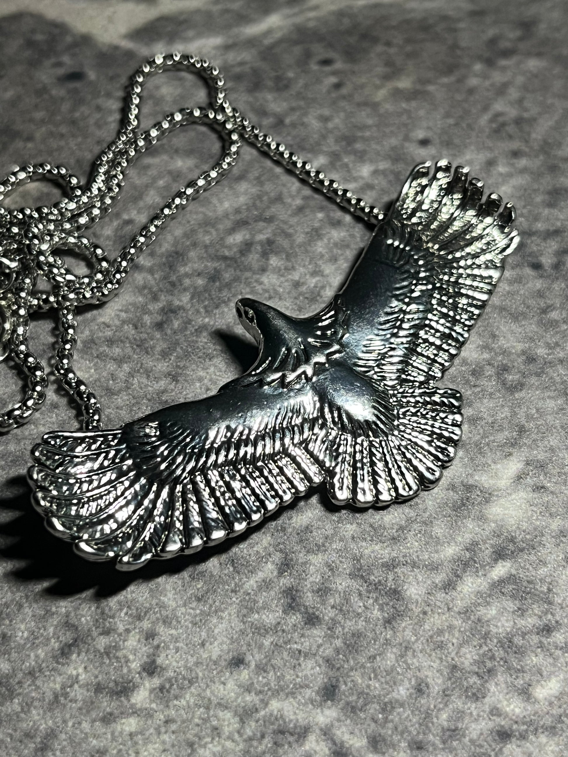 Spread your wings with a piece that symbolizes strength, vision, and freedom. The Soaring Eagle Pendant features an intricately detailed eagle in mid-flight, suspended from a durable, high-polish ball chain.