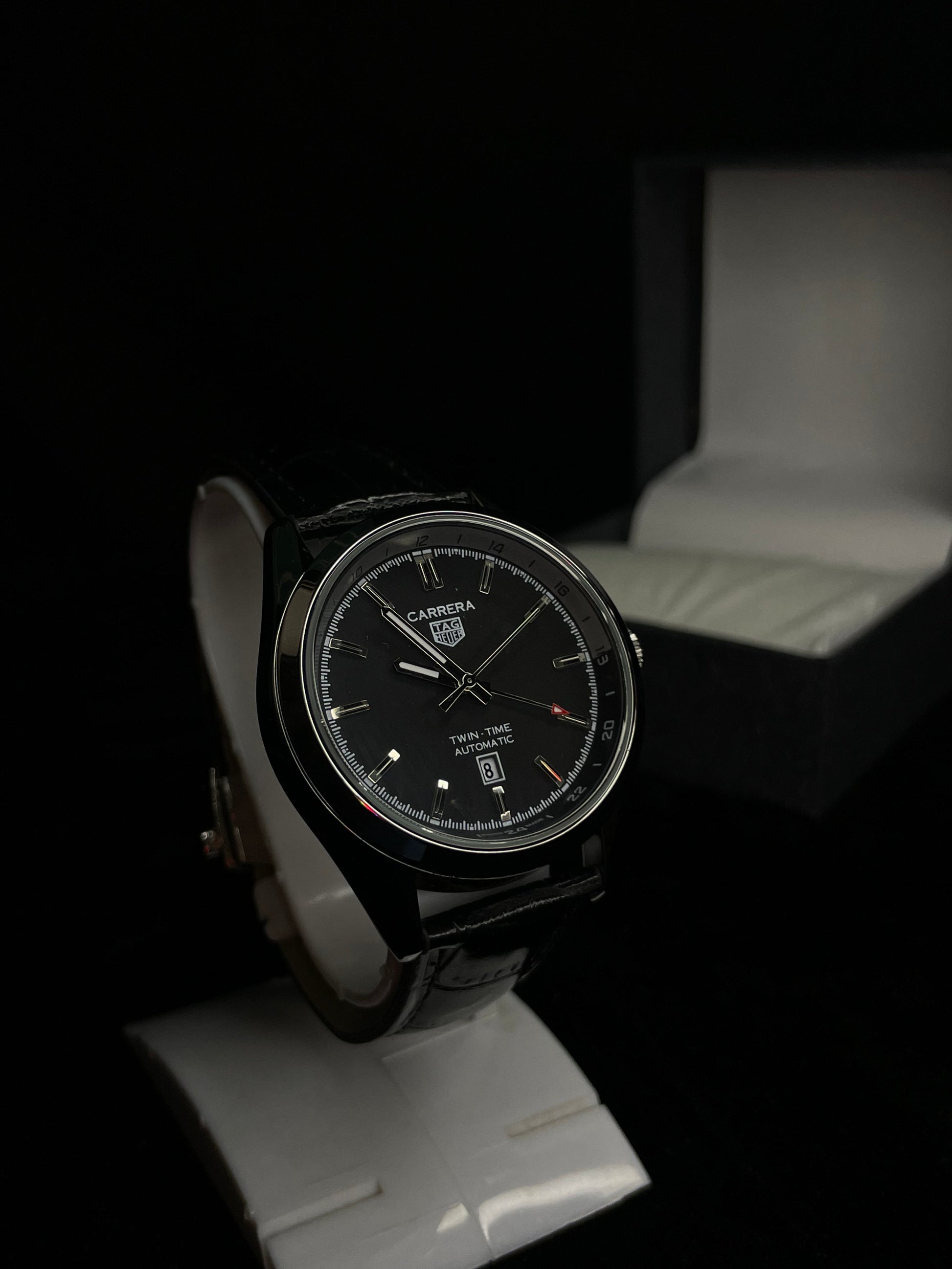Discover the perfect blend of precision, elegance, and functionality with the TAG Heuer Carrera Twin-Time Automatic. Crafted for the modern traveler and connoisseur, this iconic timepiece features a bold black dial with dual time zone functionality, wrapped in a refined case and secured by a classic leather strap.