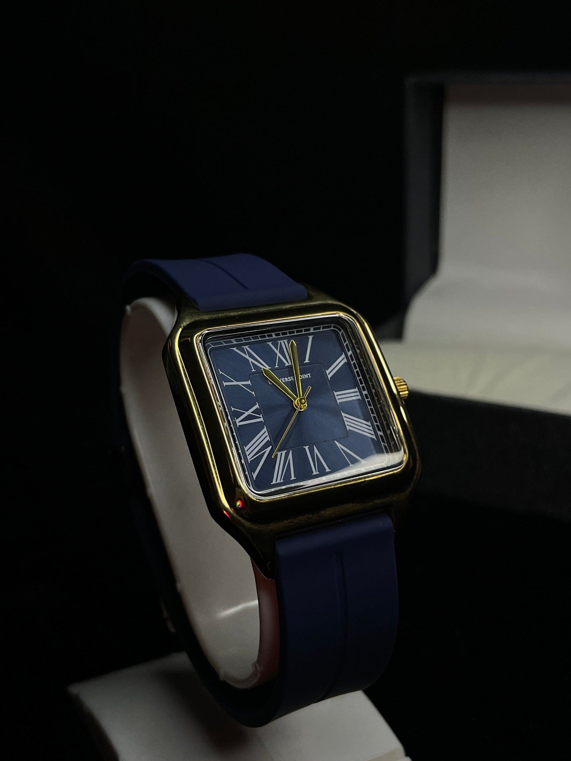 A striking blend of classic detailing and modern edge, the Universe Point Watch features a rich blue dial with Roman numerals, housed in a refined gold-tone case, and paired with a sporty blue rubber strap. Perfect for those who want timeless sophistication with a contemporary twist.
